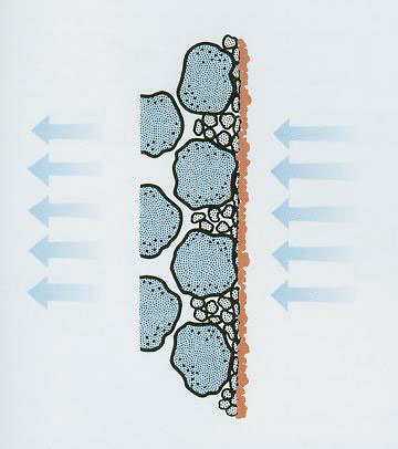 在塑燒濾板的母體基板內(nèi)部,經(jīng)過對時間、溫度的控制燒結后,會形成均勻孔隙。然后由樹脂填充表面處理,使孔隙達到均勻的u級微孔。獨特的表面處理不僅只限于濾板表面,而是深入到孔隙內(nèi)部。見圖一。