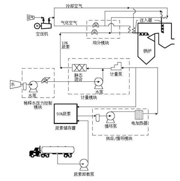 ? ? ? ?SNCR系統(tǒng)工藝流程示意。爐膛壁面上安裝有還原劑噴嘴,還原劑通過噴嘴噴入煙氣中,并與煙氣混合,反應(yīng)后的煙氣流出鍋爐。整個(gè)系統(tǒng)由還原劑貯槽、還原劑噴入裝置和控制儀表所構(gòu)成。氨是以氣態(tài)形式噴入爐膛,而尿素是以液態(tài)形式噴入,兩者在設(shè)計(jì)和巧行上均有差別。尿素相對(duì)氨而言,貯存更方便且能更好地在煙氣中分散,對(duì)于大型鍋爐,尿素SNCR應(yīng)用更普遍。當(dāng)氨與NOx反應(yīng)不完全時(shí),未反應(yīng)完全的NH3將從SNCR系統(tǒng)逸出。反應(yīng)不完全的原因主要來自兩個(gè)方面:一種是因?yàn)榉磻?yīng)的溫度低,影響了氨與NOx的反應(yīng);另一種可能是噴入的還原劑與煙氣混合不均勻。因此,還原劑噴射系統(tǒng)必須將還原劑噴入到鍋爐內(nèi)有效的部位,以保證氨與NOx的混合均勻。
