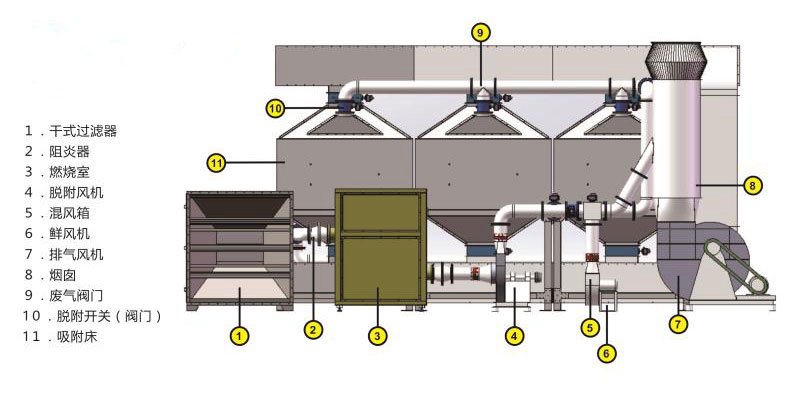 采用 “固定床吸附+RCO催化氧化設(shè)備”,其優(yōu)點(diǎn)為可靠、處理效率高,同時,不會產(chǎn)生二次污染,不會像其它處理方式如顆粒炭易發(fā)生自燃現(xiàn)象等,做到真正的節(jié)能、環(huán)保。采用系統(tǒng)自動脫附、增加蓄熱體、盡可能降低運(yùn)行成本。