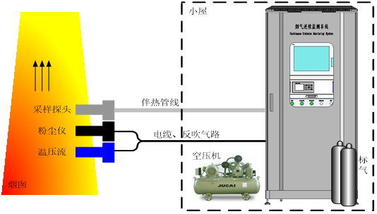 本系統(tǒng)由置于煙囪上的采樣探頭、粉塵儀和溫壓流一體化探頭,以及置于小屋中的分析機柜、標(biāo)氣和壓縮氣源組成。