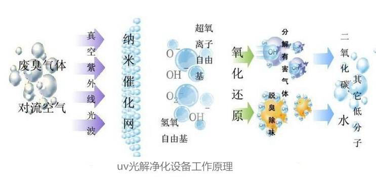 特制UV紫外線燈:利用特制的高能高臭氧UV紫外線光束照射廢氣,裂解工業(yè)廢氣如:氨、硫化氫、甲硫氫、甲硫醇、甲硫醚、乙酸丁酯、乙酸乙酯、二甲二硫、二硫化碳和苯乙烯,硫化物H2S、VOC類,苯、甲苯、二甲苯的分子鏈結(jié)構(gòu),使有機(jī)或無機(jī)高分子惡臭化合物分子鏈,在高能紫外線光束照射下,降解轉(zhuǎn)變成低分子化合物,如CO2、H2O等。利用高能高臭氧UV紫外線光束分解空氣中的氧分子產(chǎn)生游離氧,即活性氧,因游離氧所攜正負(fù)電子不平衡所以需與氧分子結(jié)合,進(jìn)而產(chǎn)生臭氧。 UV+O2→O-+O*(活性氧)O+O2→O3(臭氧),眾所周知臭氧對(duì)有機(jī)物具有極強(qiáng)的氧化作用,對(duì)工業(yè)廢氣及其它刺激性異味有效果。工業(yè)廢氣利用排風(fēng)設(shè)備輸入到本凈化設(shè)備后,凈化設(shè)備運(yùn)用高能UV紫外線光束及臭氧對(duì)工業(yè)廢氣進(jìn)行協(xié)同分解氧化反應(yīng),使工業(yè)廢氣物質(zhì)其降解轉(zhuǎn)化成低分子化合物、水和二氧化碳,再通過排風(fēng)管道排出室外。利用高能-C光束裂解工業(yè)廢氣中細(xì)菌的分子鍵,破壞細(xì)菌的核酸(DNA),再通過臭氧進(jìn)行氧化反應(yīng),達(dá)到凈化及殺滅細(xì)菌的目的。