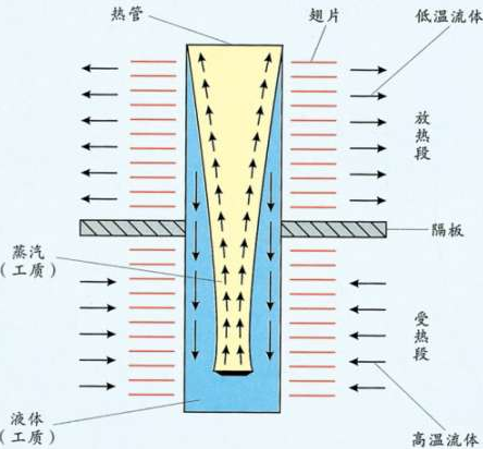 熱管工作原理:典型的重力熱管如圖所示,在密閉的管內先抽成真空,在此狀態(tài)下充入適量工質,在熱管的下端加熱,工質吸收熱量汽化為蒸汽,在微小的壓差下,上升到熱管上端,并向外界放出熱量,凝結為液體。冷凝液在重力的作用下,沿熱管內壁返回到受熱段,并再次受熱汽化,如此循環(huán)往復,連續(xù)不斷的將熱量由一端傳向另一端
